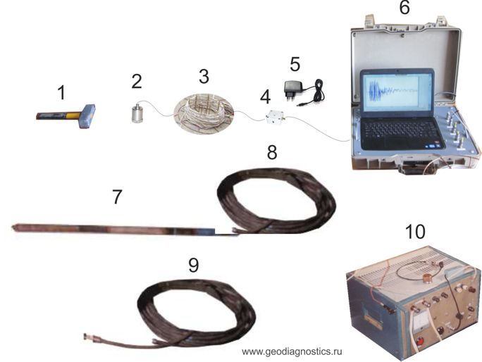 1 - impact hammer; 2 - vibration transducer; 3 - cable; 4 - transitional box; 5 - power supply; 6 - complex of software and hardware; 7 - downhole receiver; 8 - downhole receiver cable; 9 - cable with the electric spark radiator; 10 - current pulse generator
