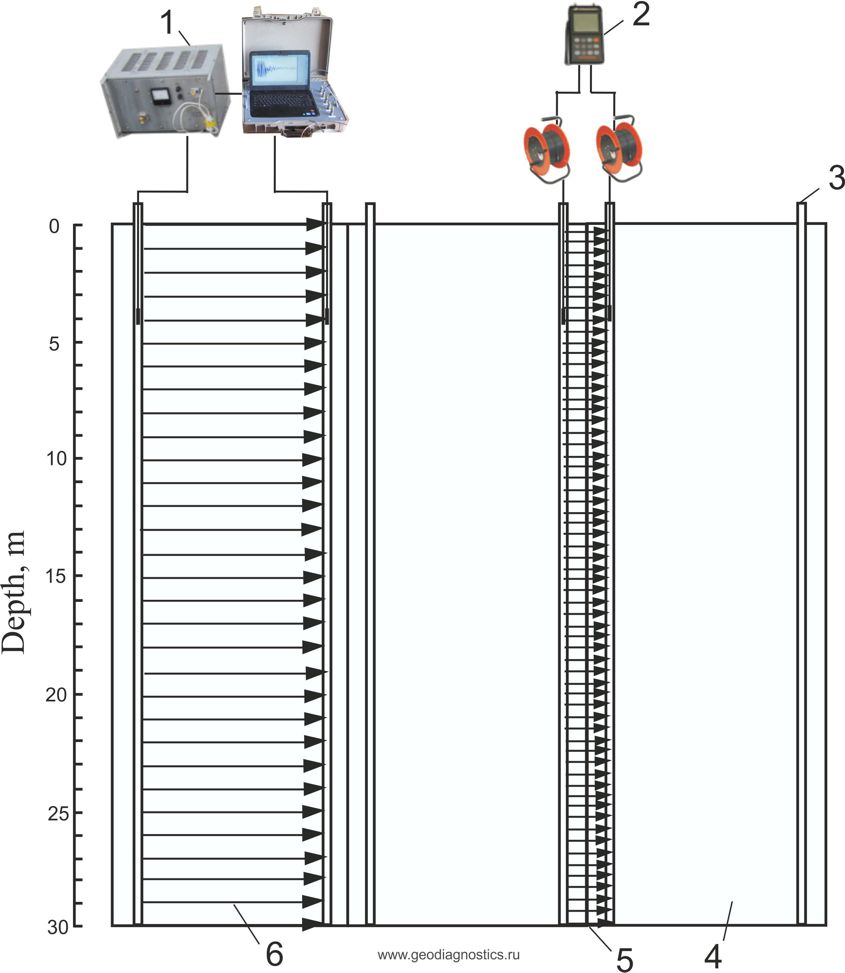The sounding methodology includes excitement and receipt of an elastic wave impulse in holes (embedded tubes) and assessment of crosshole environment, as a rule, based on parameters of the direct longitudinal wave going through it. The monitoring system is selected on the basis of tasks. A survey layout (plan view) is defined by the client by positioning monitoring tubes or boring holes. Depth survey scheme: simultaneous with moving borehole tools parallel to the ground surface (Fig.1).