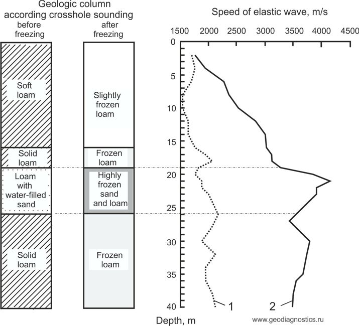 The aims of crosshole sounding fence from frozen soil was the allocation of intervals water-filled soil before freezing and determining the degree of soil freezing for the safe excavation. Water-filled soils (sandy loam with interlayers of sand) found at the depth 19-23 m (fig. 4). The range of speed of elastic wave velocity 3812-4182 m/s point to a sufficient degree of freezing of water-filled soils for safe excavation.