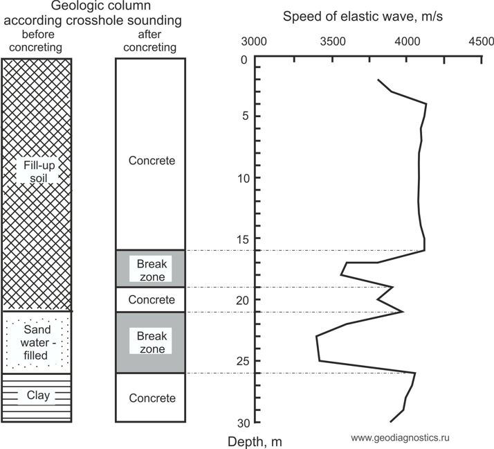 Graphics on speed of elastic wave in the concrete slurry wall - depth relationship at the site of construction of the smoke extraction mine DU2 of the Complex protect St. Petersburg from floods are to be seen on fig. 3. Reducing the speed of elastic wave in concrete occur in areas of divergence of neighboring concrete piles in the intervals of occurrence of the fill-up soil and water-filled sand. Discontinuity zones in the concrete slurry wall have caused the inflow of water into the mine in the process of excavation.
