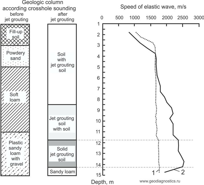 Graphics on speed of elastic wave in jet grouting massif - depth relationship at the site of construction of the building of the second stage of the State Academic Mariinsky Theatre are to be seen on fig. 4. Geological section on the complex seismic acoustic indication was divided by depth into the following intervals: 0 - 8,5 m - modified soil with jet grouting soil; 8,5 - 11,75 m - jet grouting soil with the inclusion of soil; 11,75 - 14,25 m - monolithic jet grouting soil; below 14,25 m - sandy loam. The maximum speed of elastic waves fixed in the interval 11,75 - 14,25 m there was deposition monolithic jet-grouting plate.