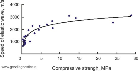 The speed of elastic wave in linked to concrete, jet-grouting and frozen soil strength. If there is an non-integral area (pores, fracturing) in the path of the elastic wave in the tested object, then an "acoustic shadow" is observed in the form of a sharp decrease of speed, range and frequency of the elastic wave impulse.